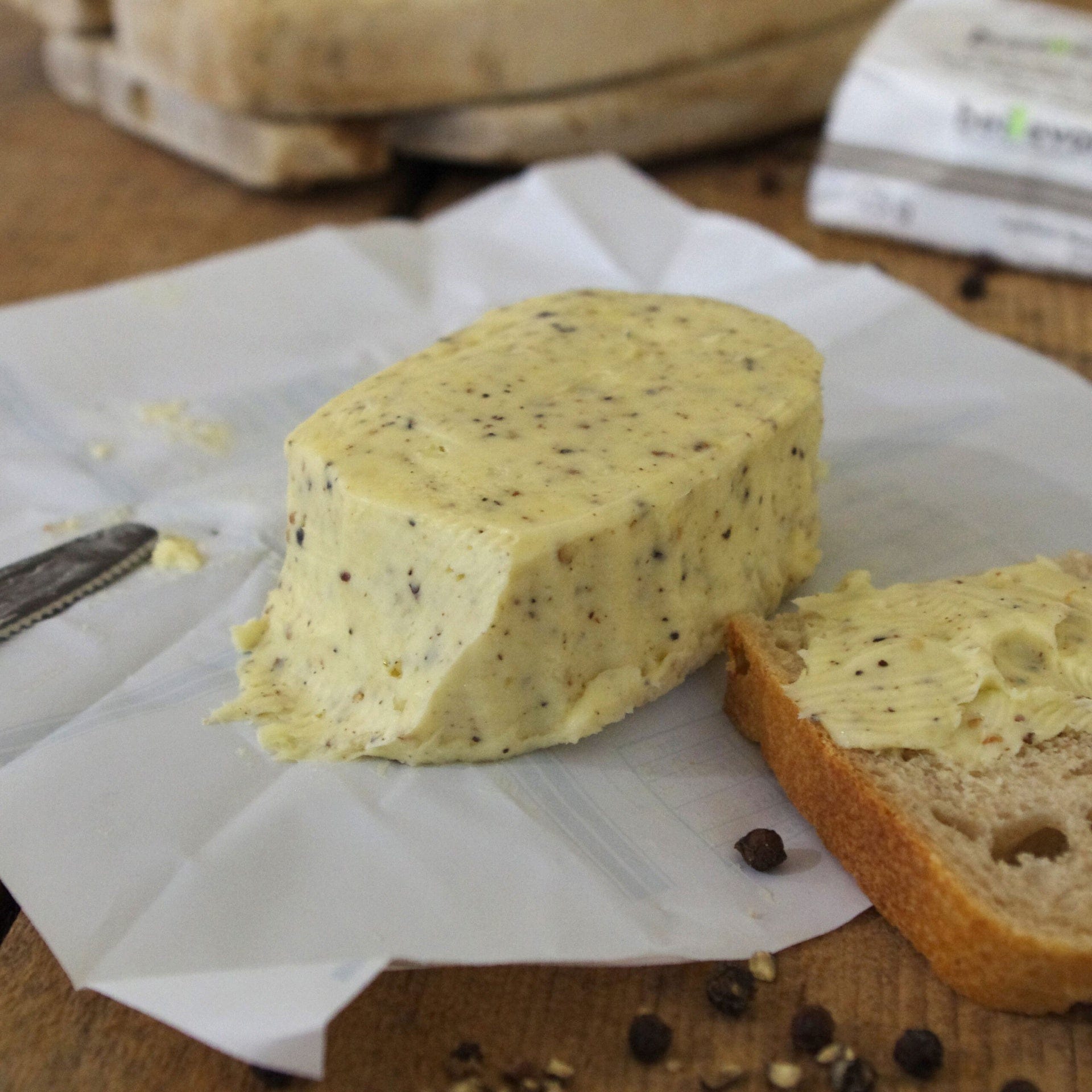 Beurre de baratte pasteurisé (crème pasteurisée, ferments lactiques), fleur de sel, poivres des mondes (poivre blanc, noir, long, sichuan, cubèbe, maniguette).