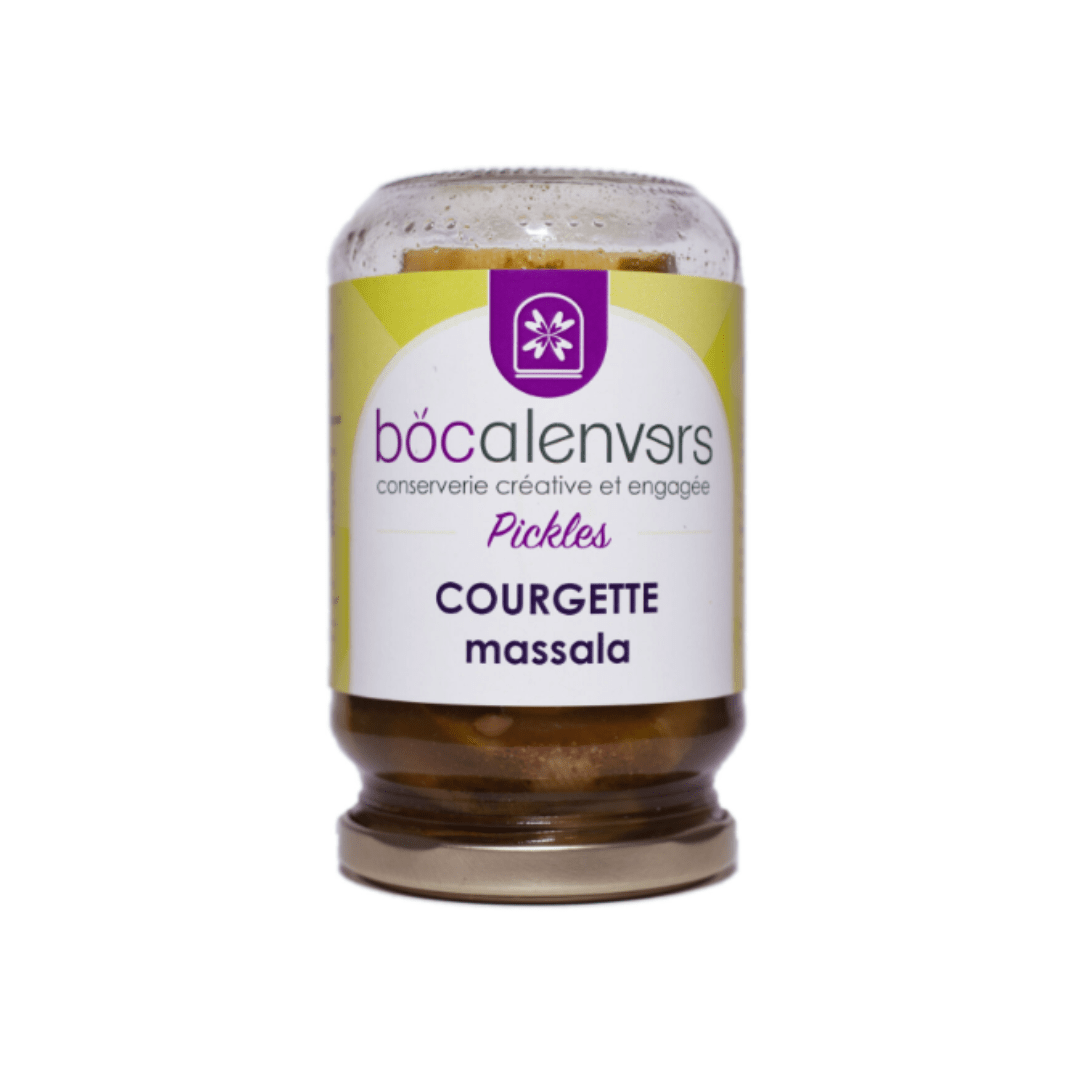 Courgettes (52%), eau, vinaigre blanc, vinaigre de cidre, sucre blanc, sel, garam masala (<1%), graines de coriandre, curcuma