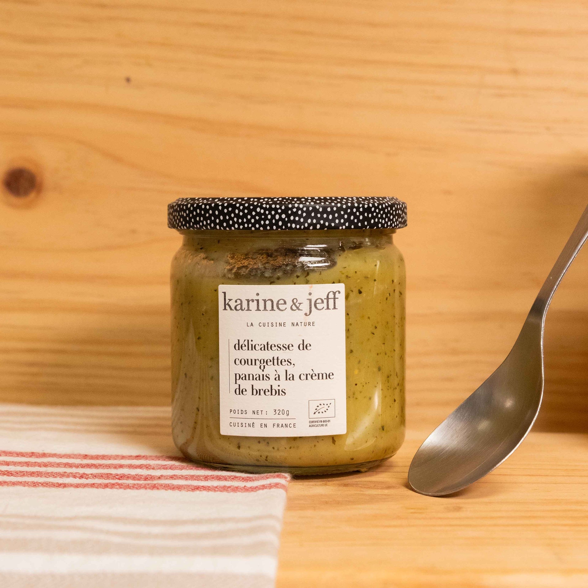 courgettes* (51%), panais* (32%), oignons* (13%), eau pure du parc régional du Haut-Languedoc, crème de brebis* (lait|orig. Sud-Ouest), sel de Guérande garanti Nature & Progrès, parmesan* (0,3 %|lait).