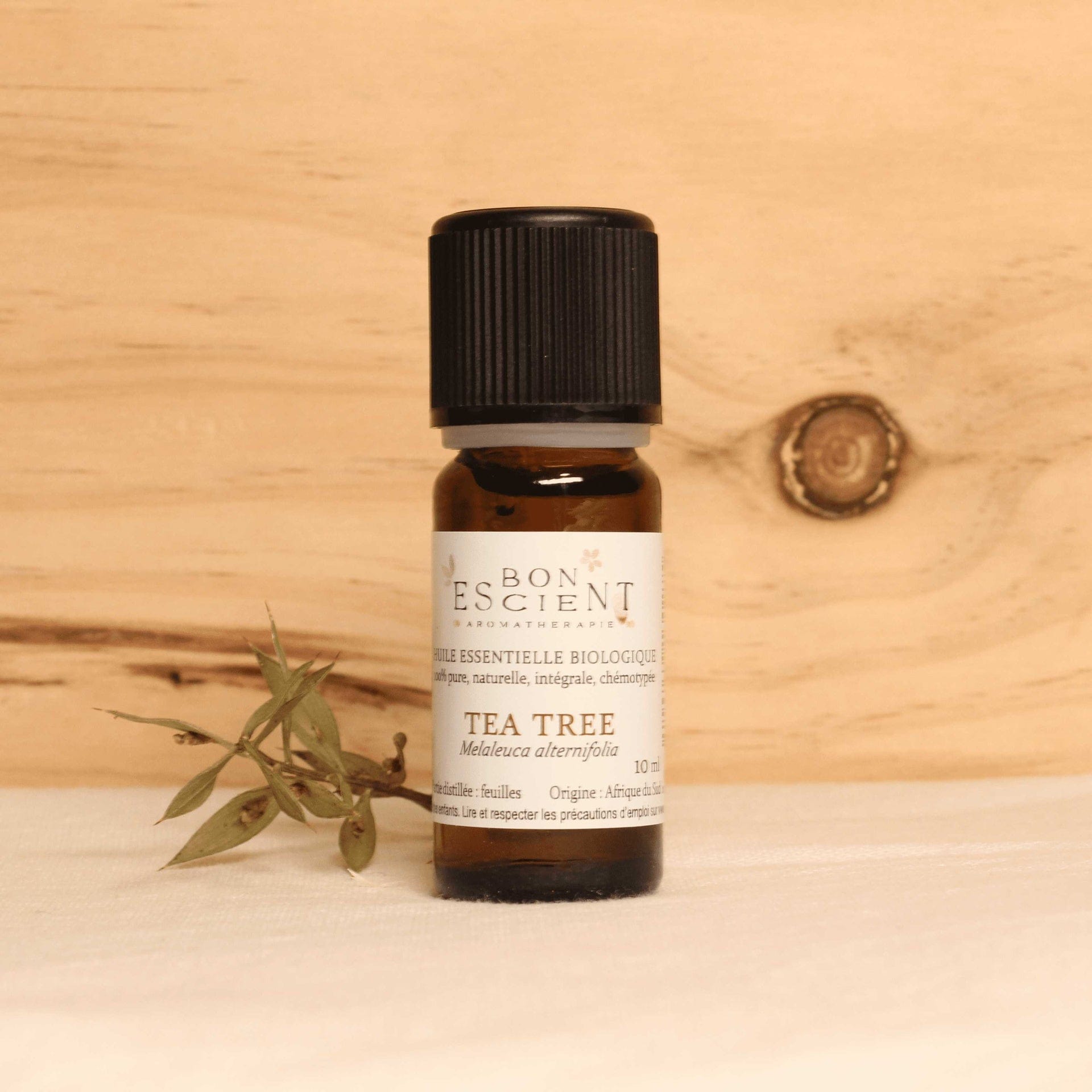 Huile essentielle de tea tree bio, obtenue à partir de la distillation des feuilles. Melaleuca alternifolia*. Principaux constituants biochimiques ou chémotype : terpinène-l-ol-4, gammaterpinène.